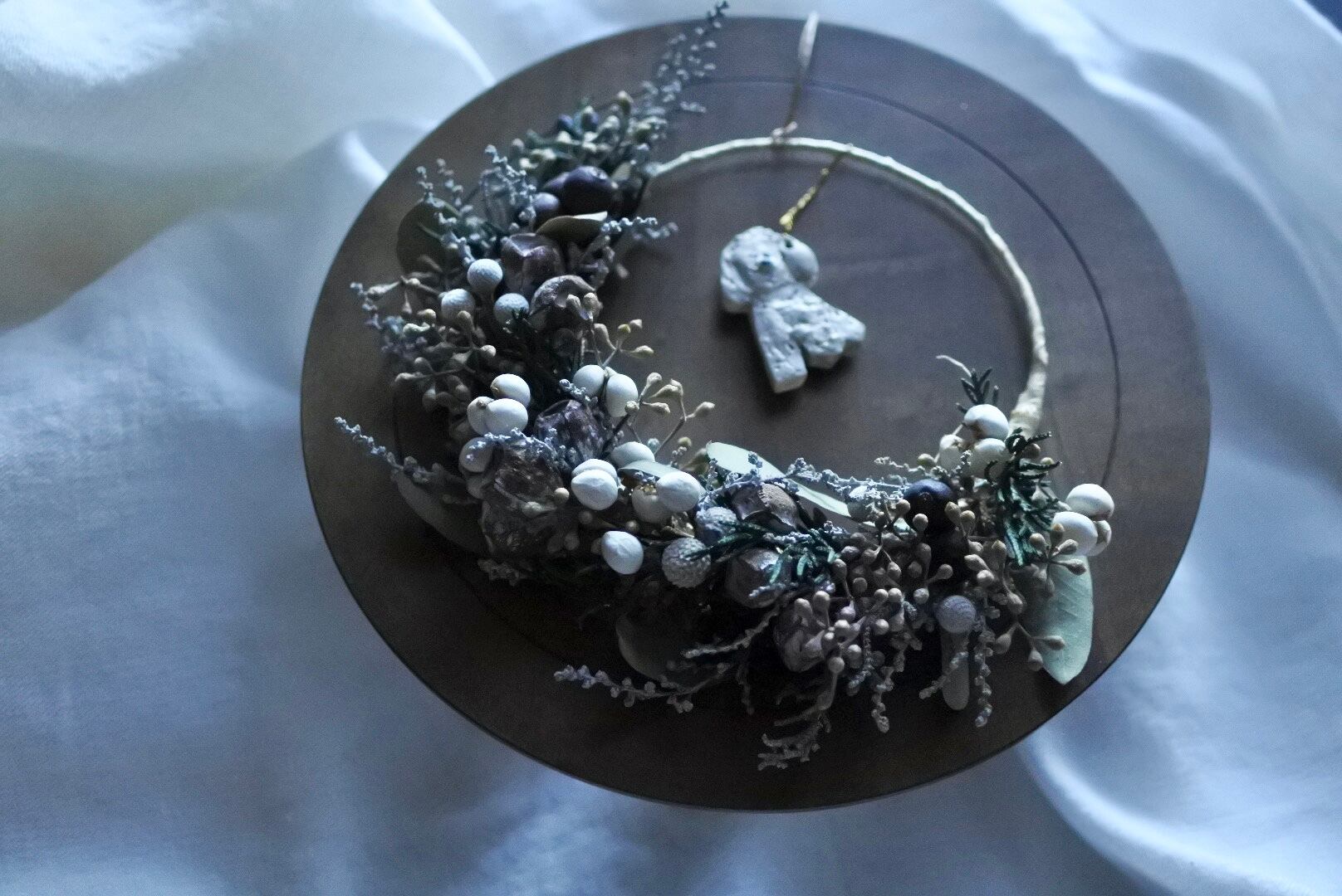 お花でできた三日月形のリースに、ワンちゃんがお花畑で楽しくお散歩している様子をイメージして創りました。