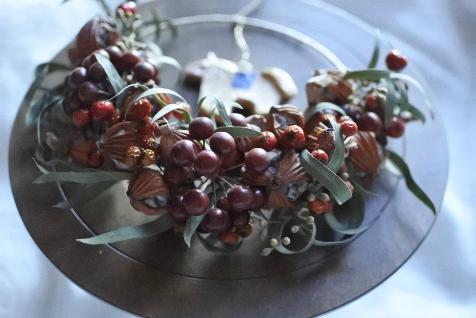 土台にラフィアでひとつづつ巻き付けて作っています。