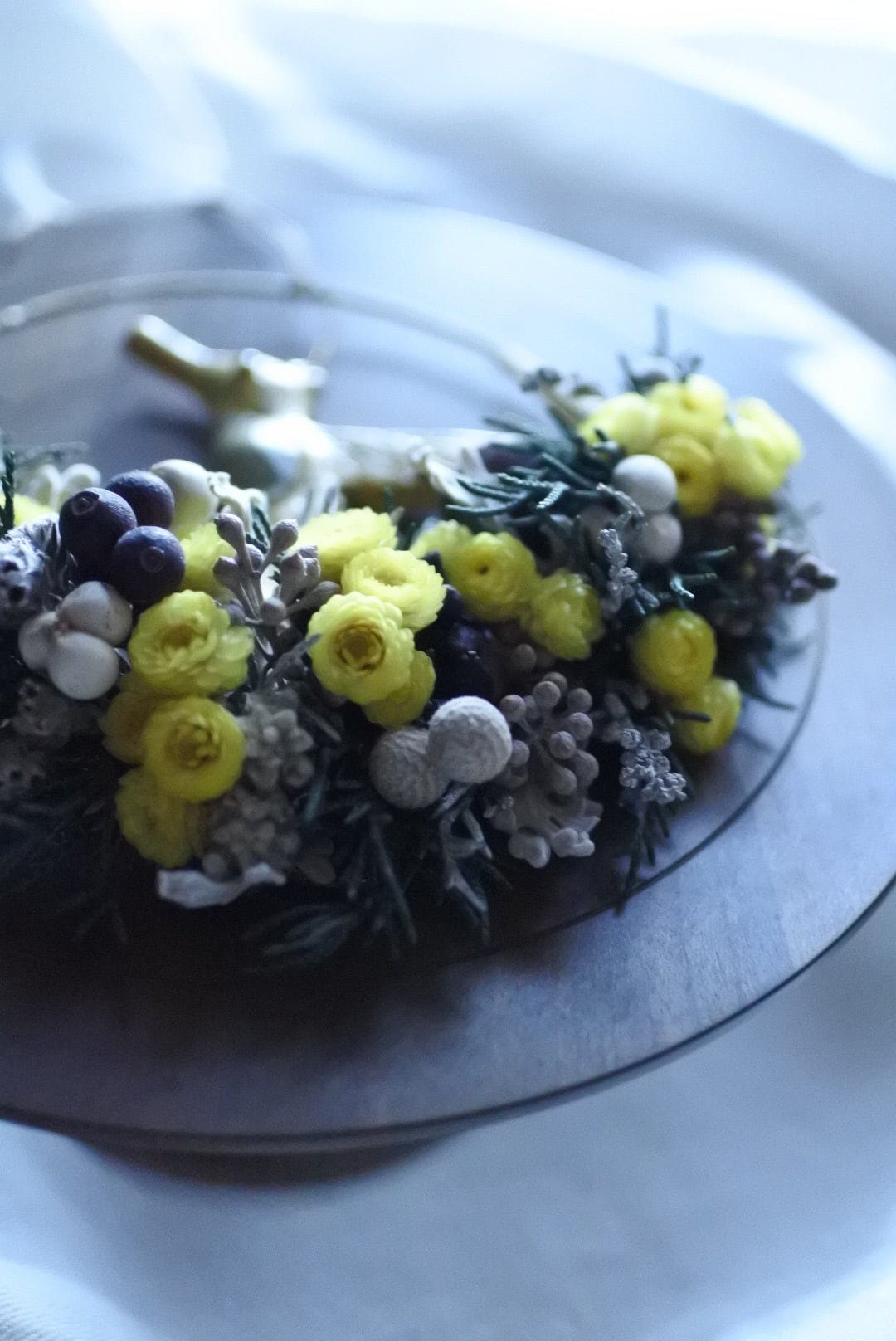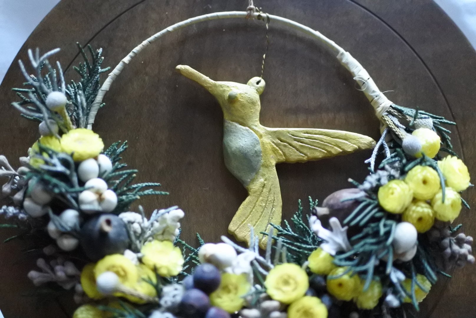 ハチドリの黄色とイモーテルの黄色が明るい雰囲気のリースです。