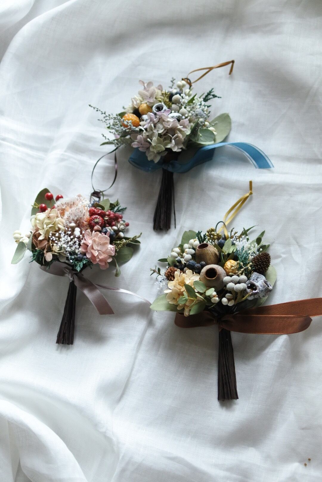 ブーケは一本一本ワイヤリングをして沢山の実物を束ねました。