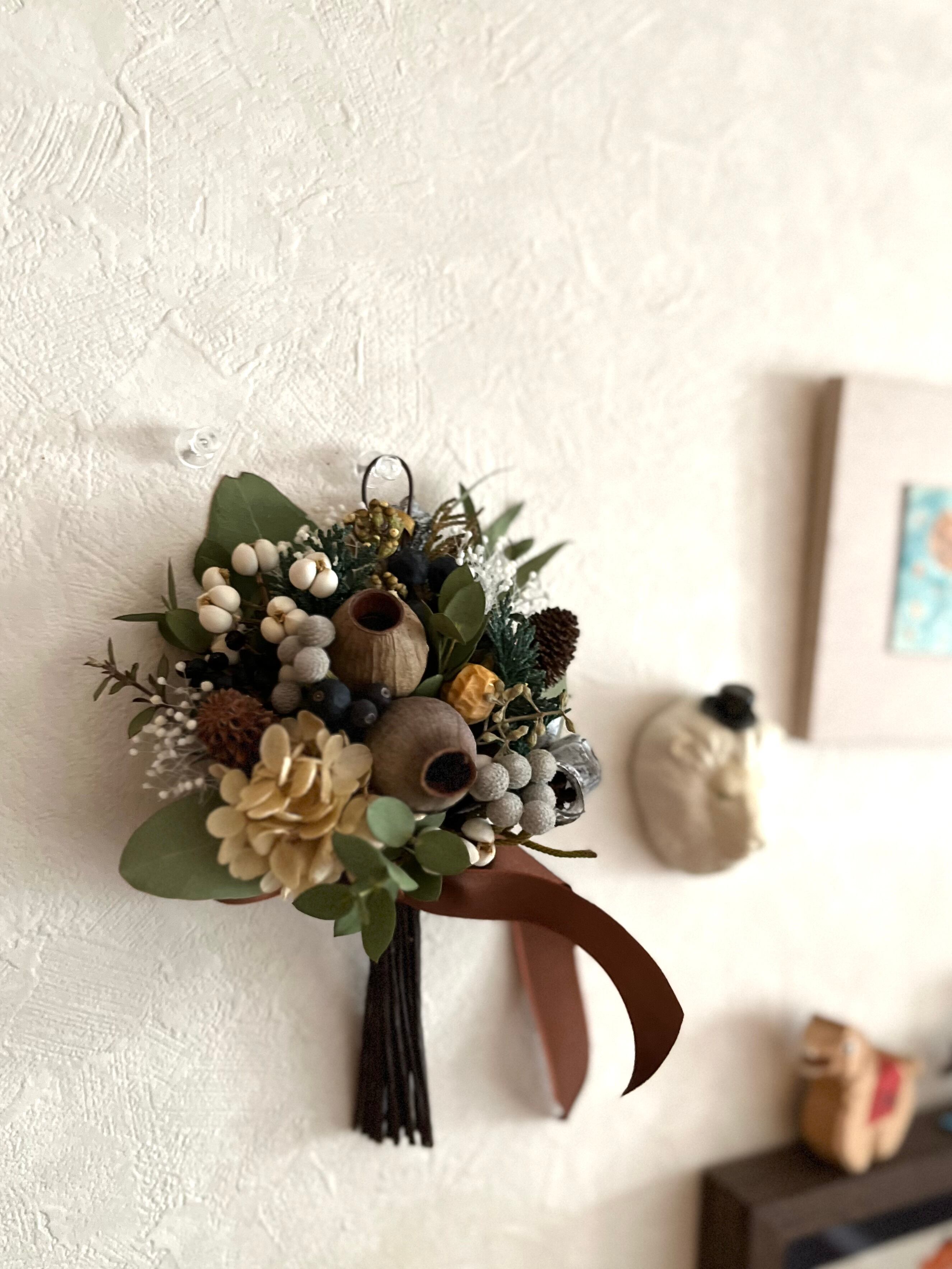 ブーケを壁にかけれたら素敵だなと思い制作したブーケスワッグです。