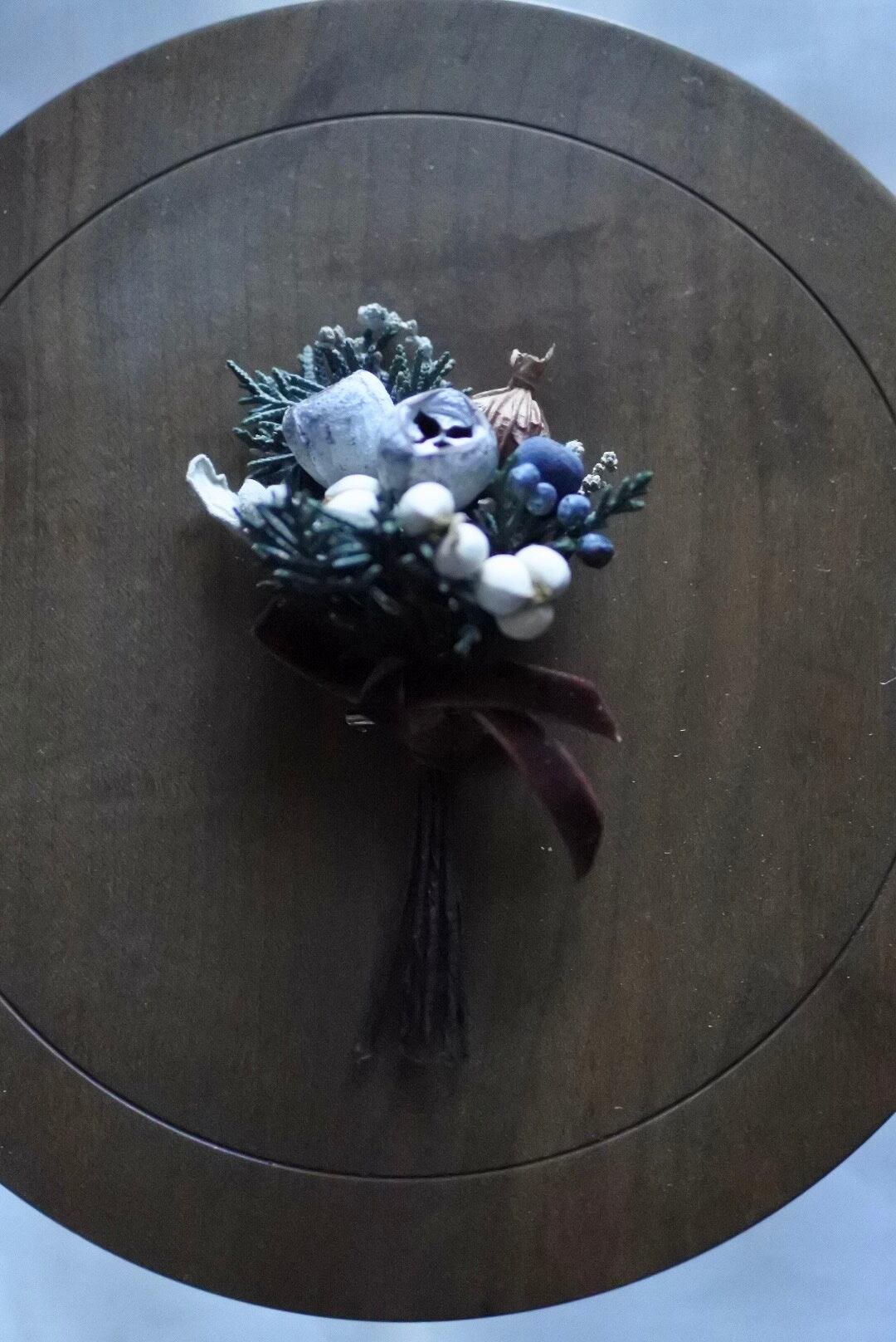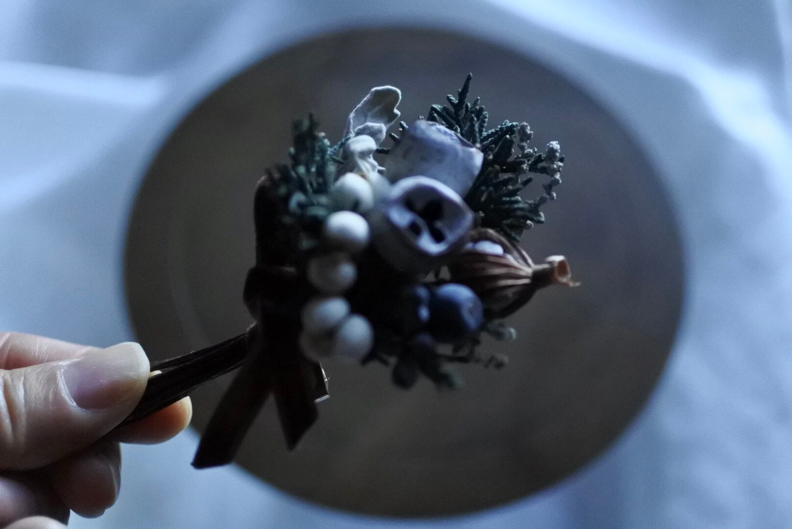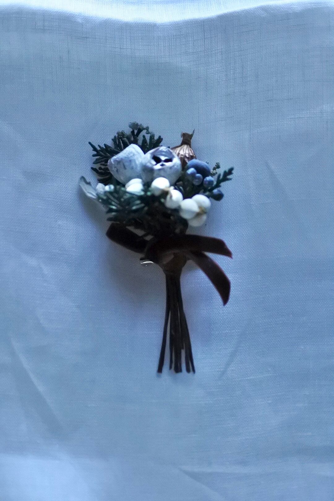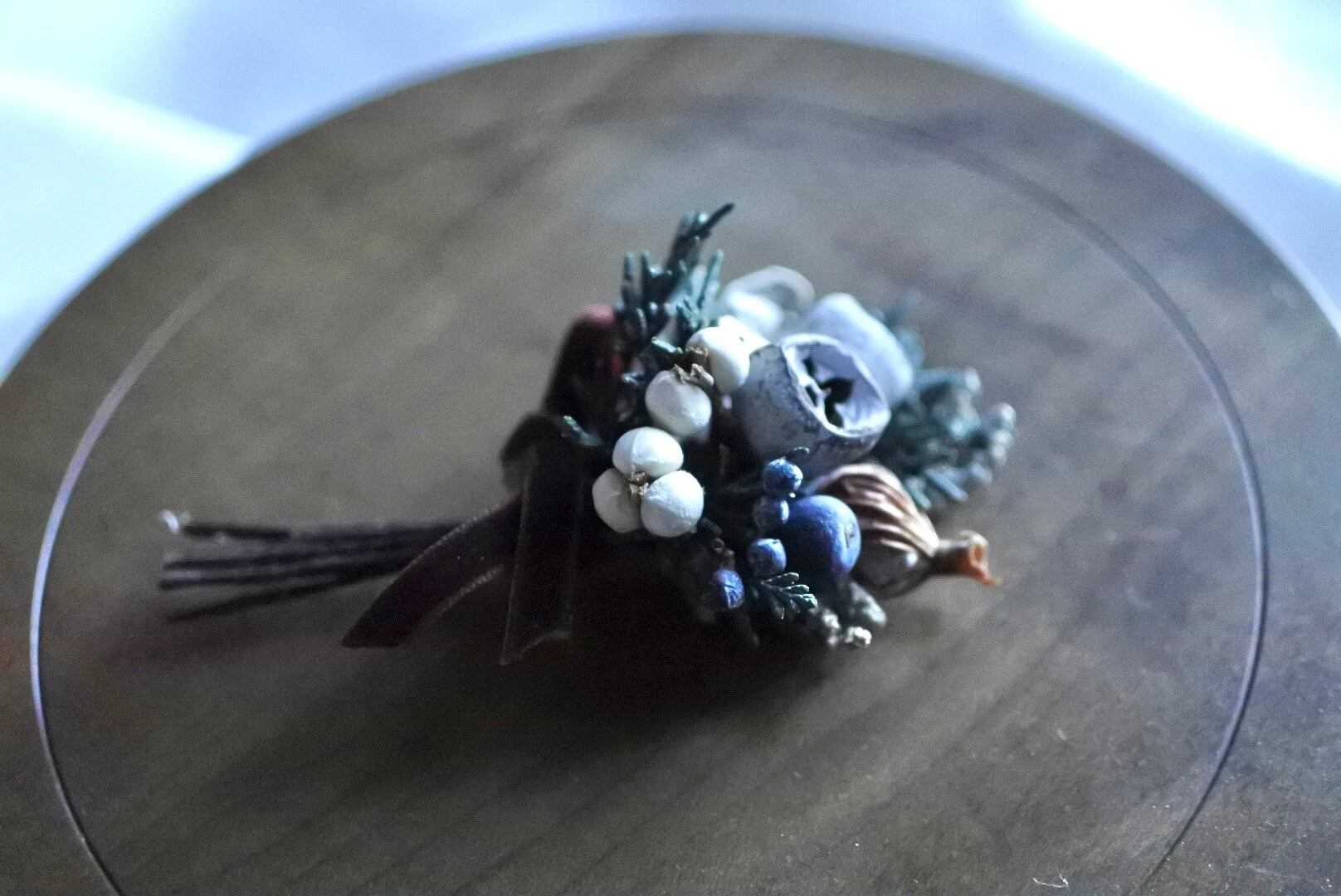 テトラゴナの白い実物が存在感のあるコサージュです。