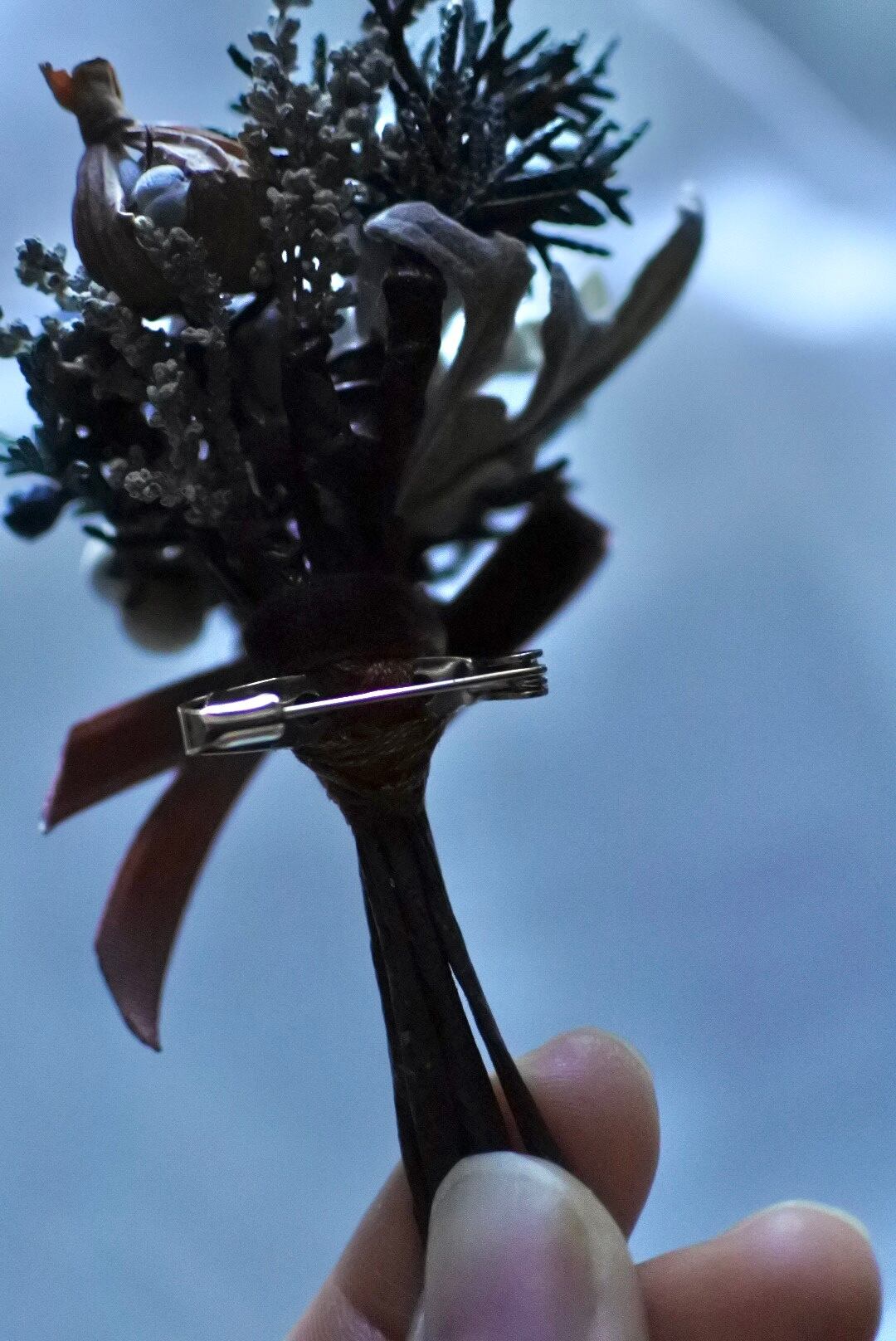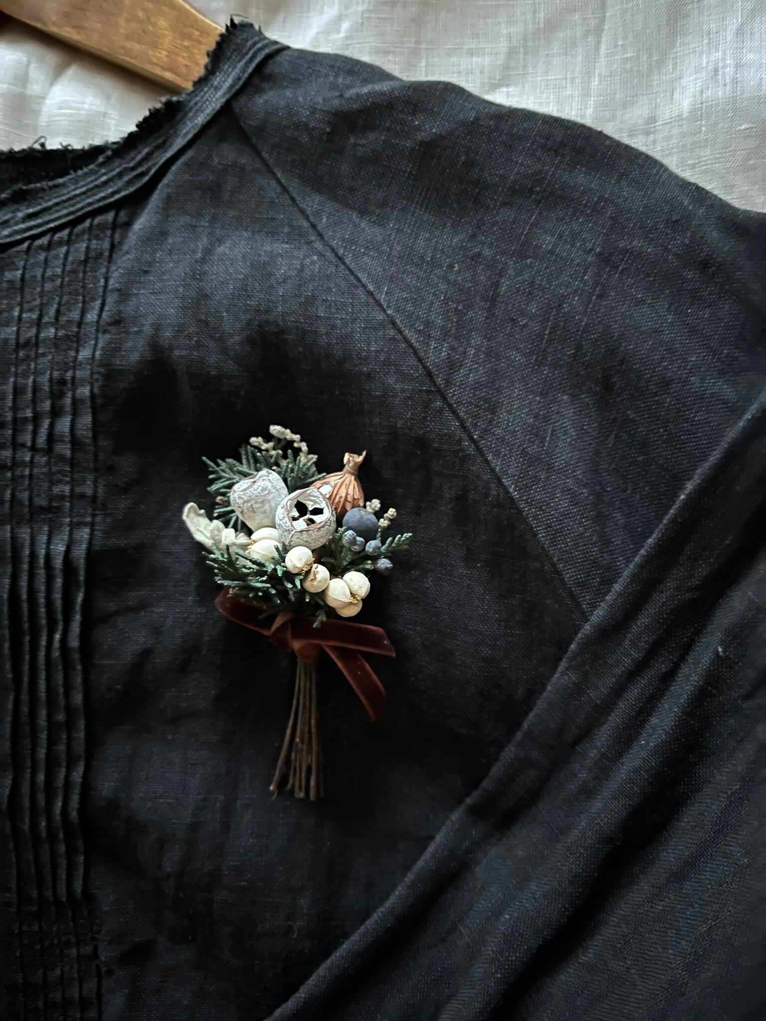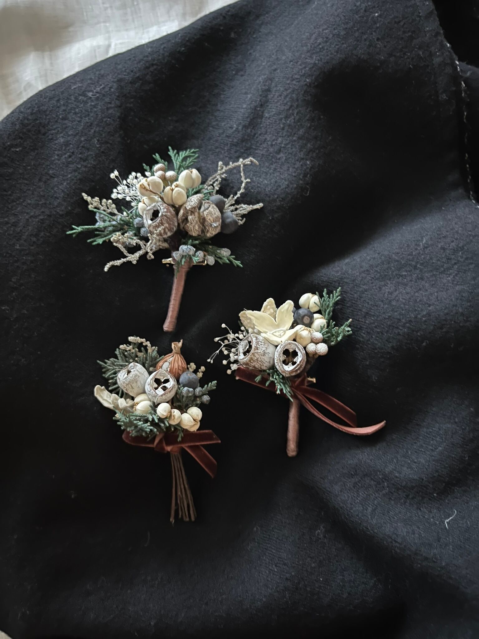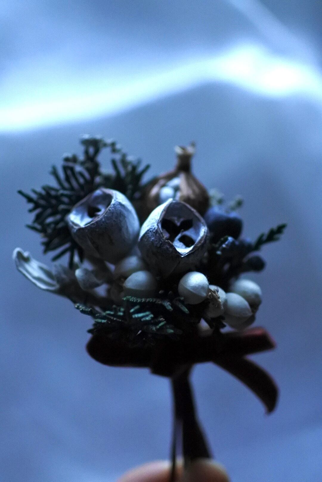 テトラゴナの白い実物が存在感のあるコサージュです。