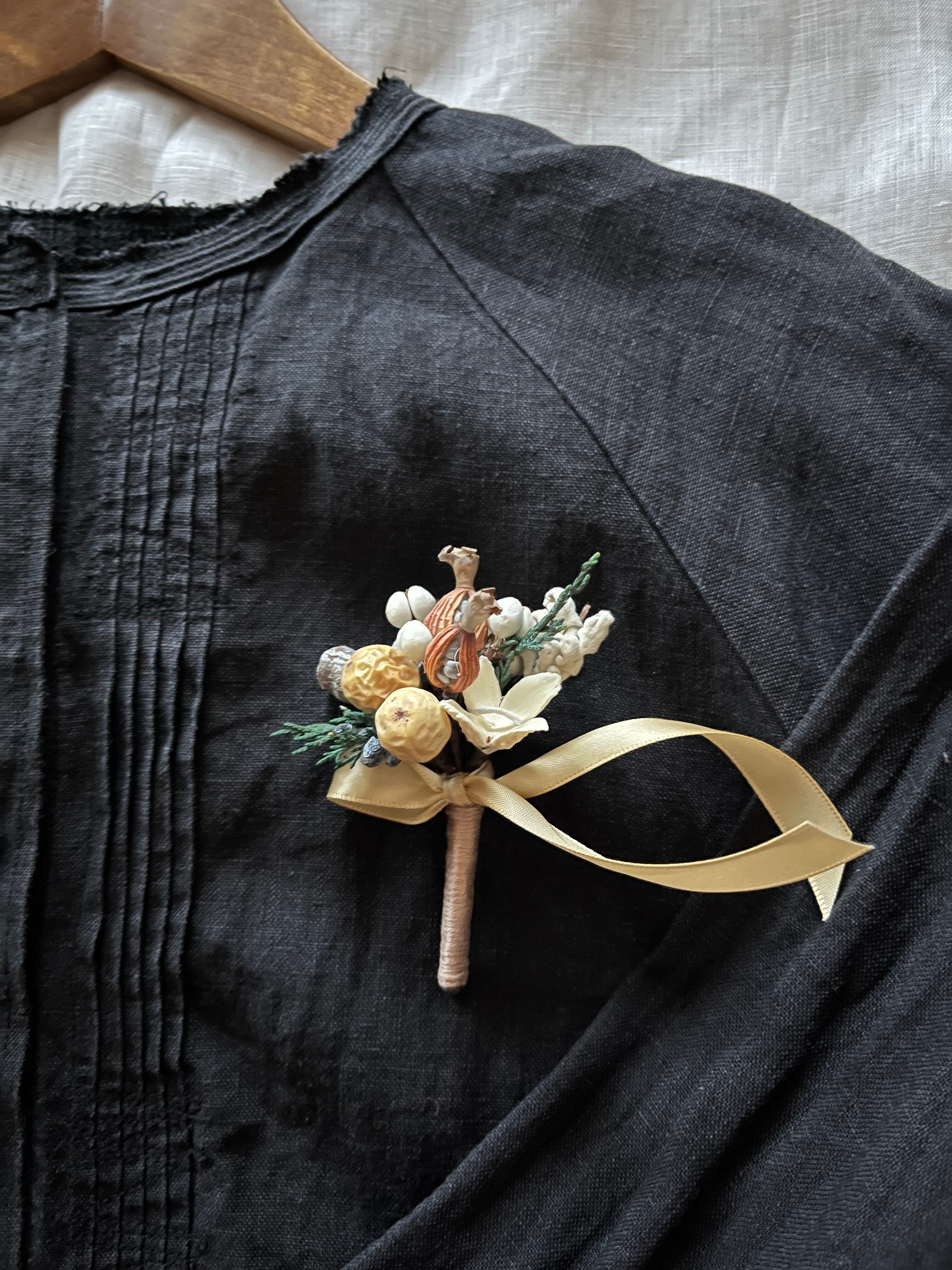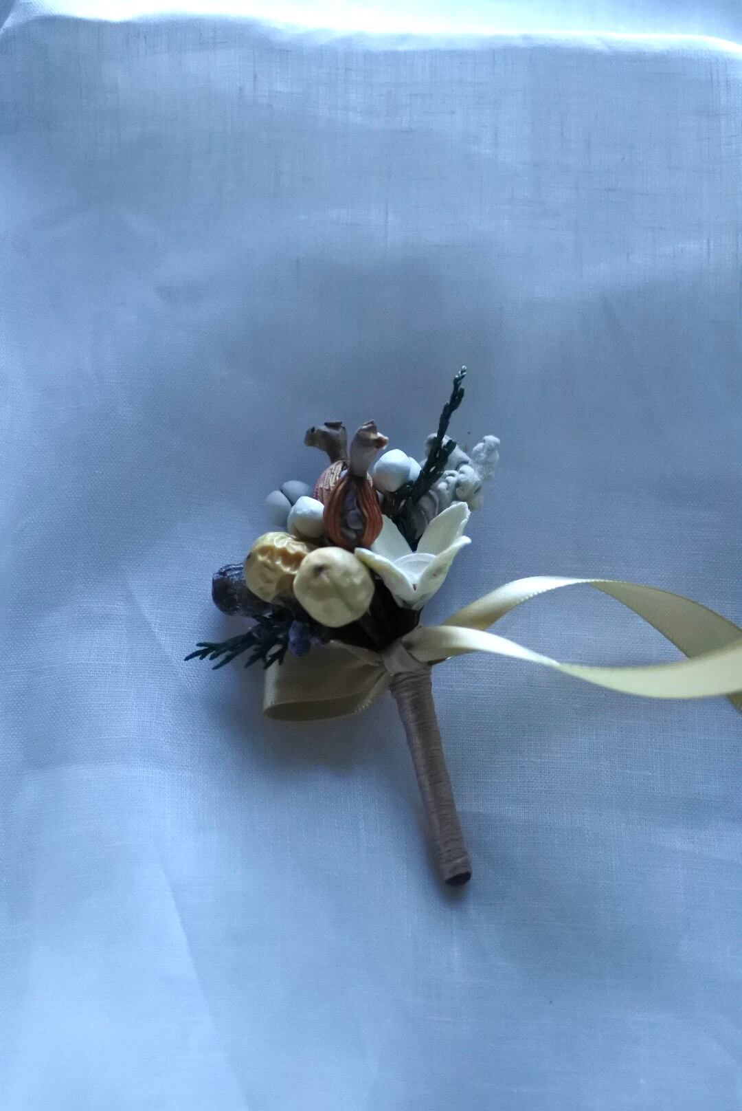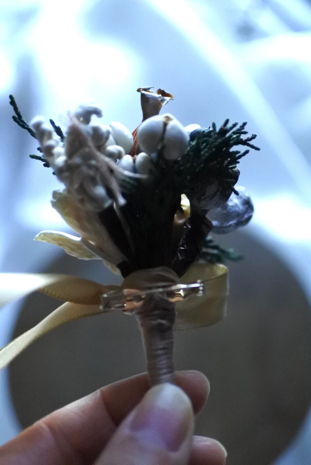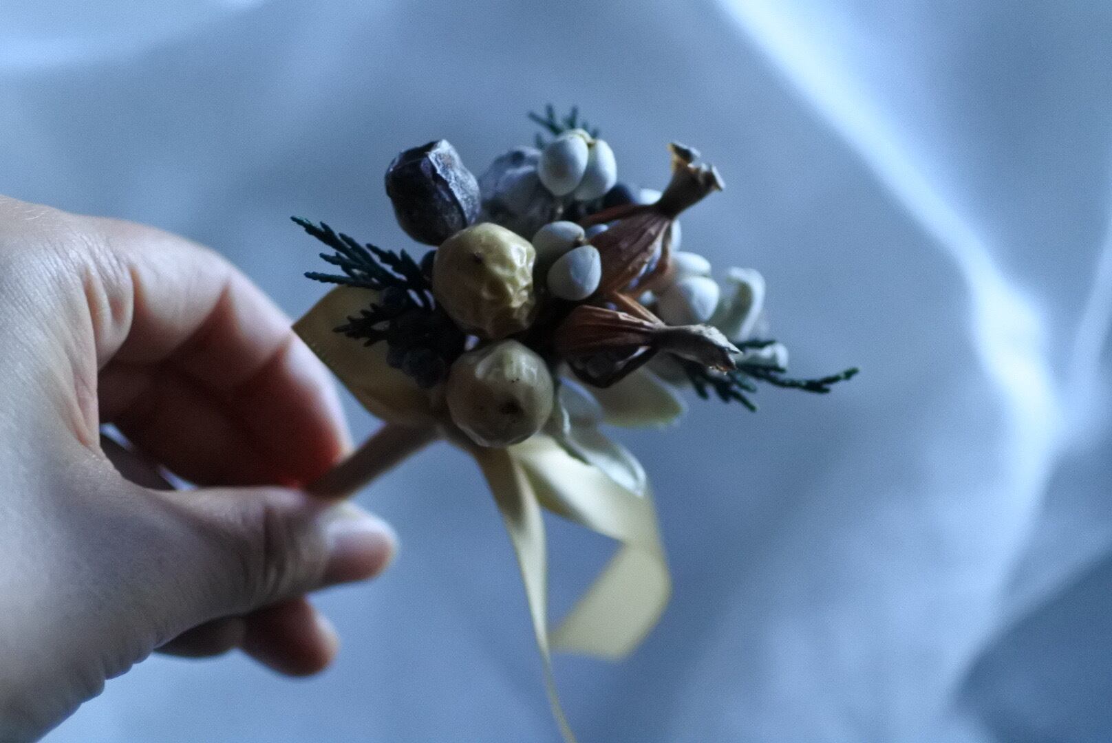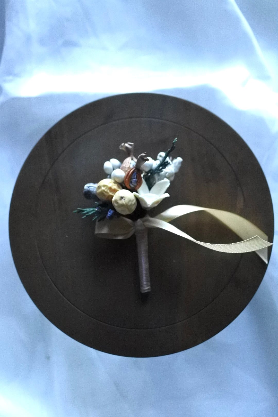 オフホワイトの実物が優しい雰囲気のコサージュです。